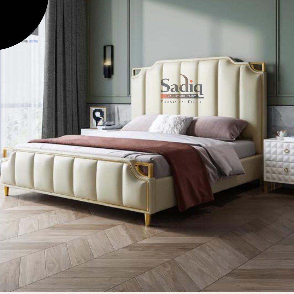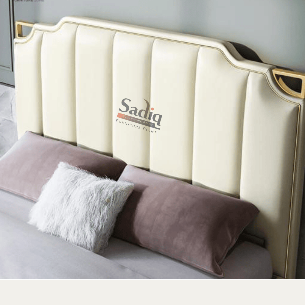 The whole bed is wrapped in a smooth, cream-colored material that looks like leather but is much easier to care for. To make it feel extra special, we added some beautiful gold metal details on the corners. It’s a simple touch that adds a bit of glamour.